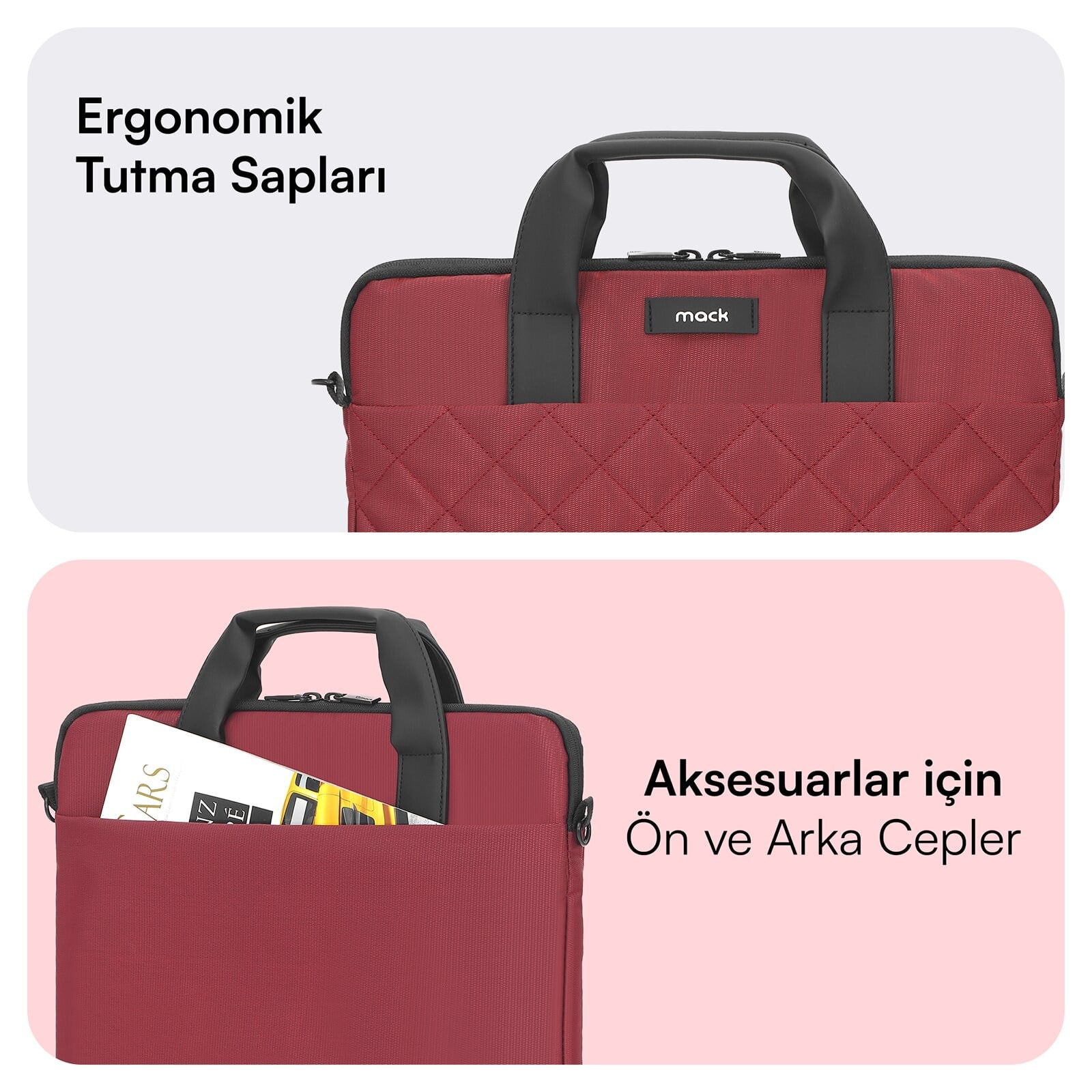 Ergonomik ve şık tasarımYıpranmaya ve suya karşı dirençli kumaş yapısıMaksimum koruma sağlayan güçlendirilmiş notebook bölümüKullanım konforu sağlayan ergonomik tutma koluAyarlanabilir omuz askılarıÖlçüler: 28 * 36 * 2,5 cmAğırlık: 0,26gRenk: Kırmızı