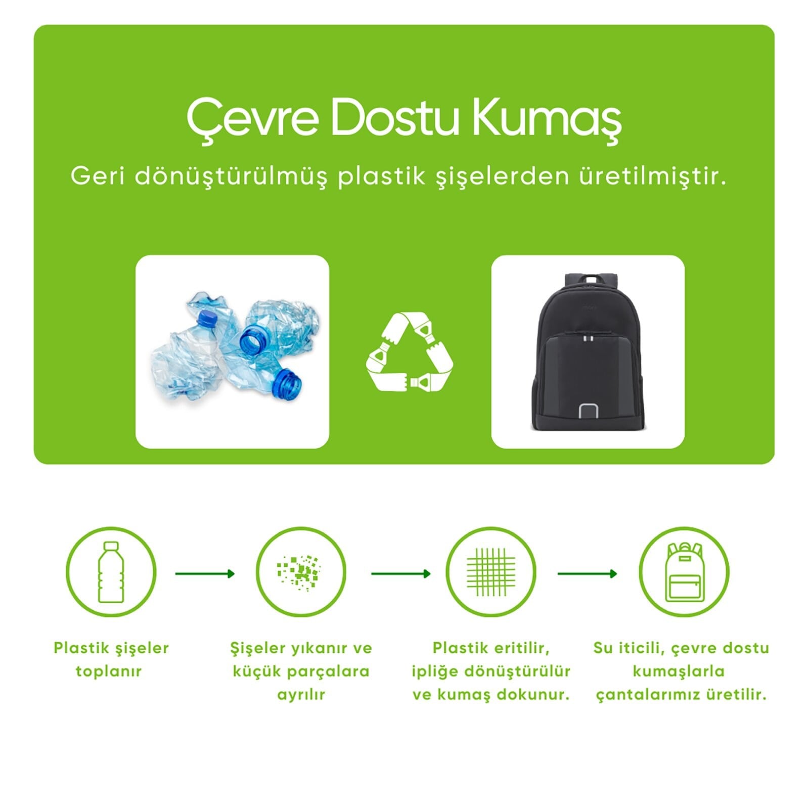 Çevreci ve Kaliteli Malzeme: Laptop çantası çevre dostu geri dönüştürülmüş su geçirmez kumaştan üretilmiş ve yüksek kaliteli YKK fermuar ile donatılmıştır. Bilgisayar çantasının tüm bileşenleri Avrupa Birliği normlarına göre Türkiye'de üretilmiştir ve hiçbir zararlı madde içermez. Mack Laptop çantaları ile bilgisayarınızı korurken aynı zamanda çevreyi de koruyun.
