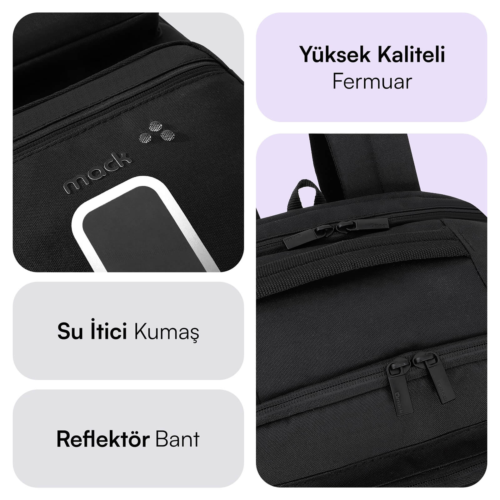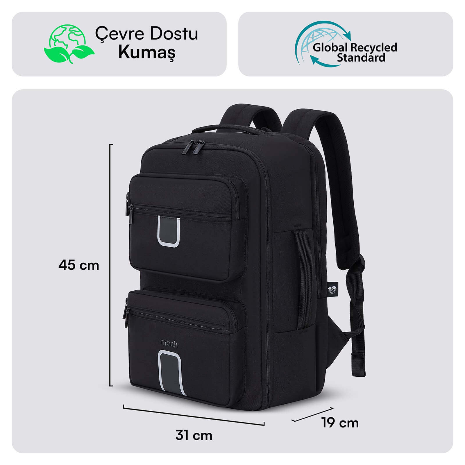 Çevreci ve Kaliteli Malzeme : Sırt çantası çevre dostu geri dönüştürülmüş su itici kumaştan üretilmiş ve yüksek kaliteli fermuar ile donatılmıştır. Bilgisayar çantasının tüm bileşenleri Avrupa Birliği normlarına göre Türkiye ’de üretilmiştir ve hiçbir zararlı madde içermez. Mack sırt çantaları ile bilgisayarınızı ve eşyalarınızı korurken, aynı zamanda çevreyi de koruyun.