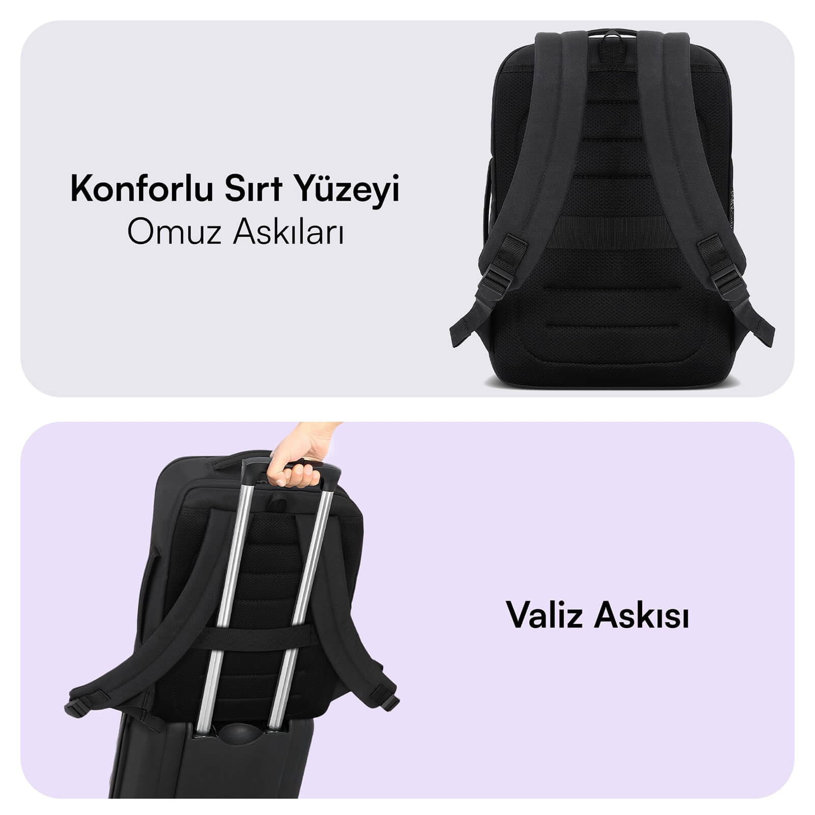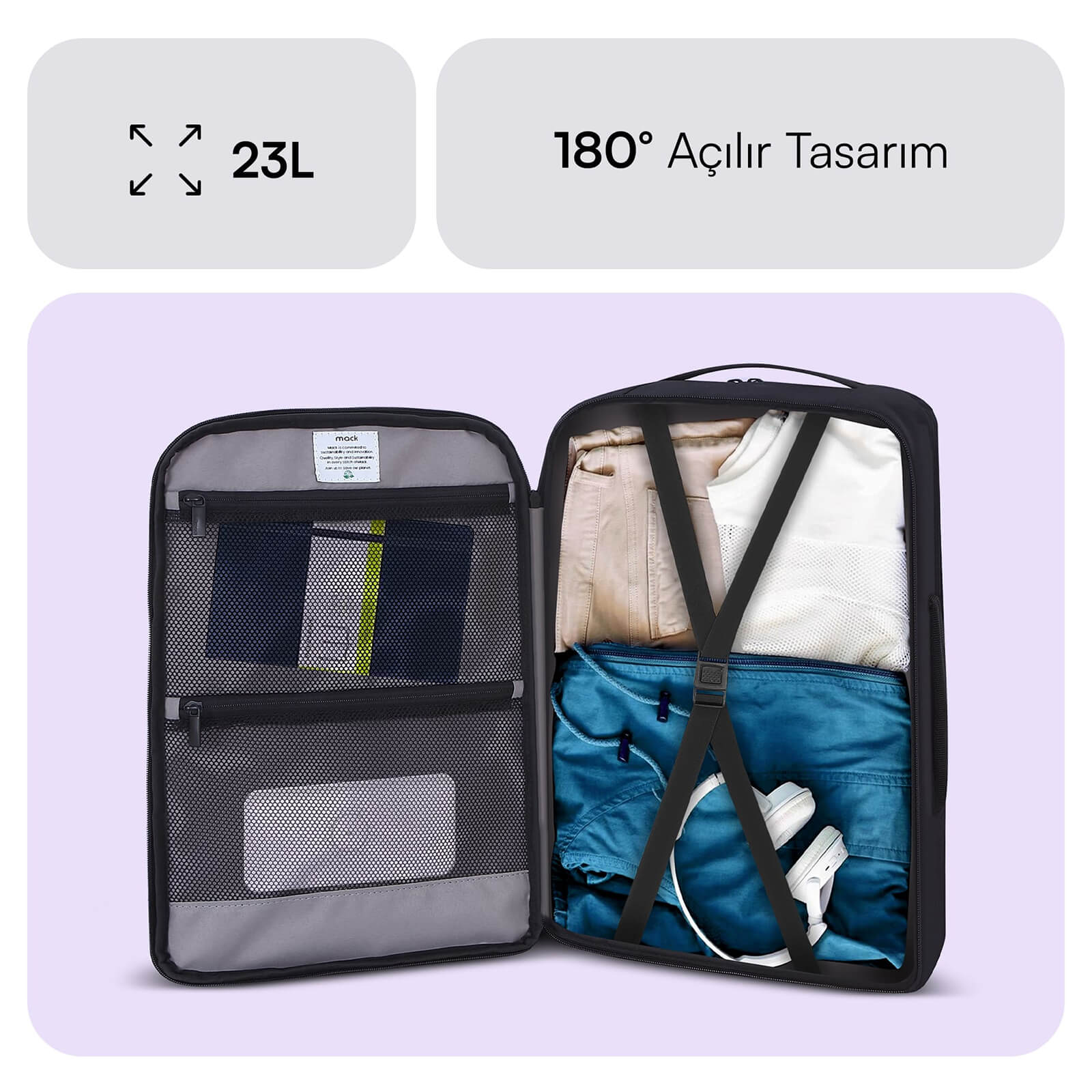 Ergonomik ve şık tasarım: Kabin boy sırt çantası, bavul gibi 180° açılabilen ana bölmesi ve çapraz esnek lastikli sabitleyici toka sayesinde eşyalarınızın kolayca yerleştirilmesini ve düzenlenmesini sağlar. İç cepleri sayesinde aksesuarlarınızı kolayca yerleştirmenizi sağlayarak düzenli bir görüntü oluşturur.