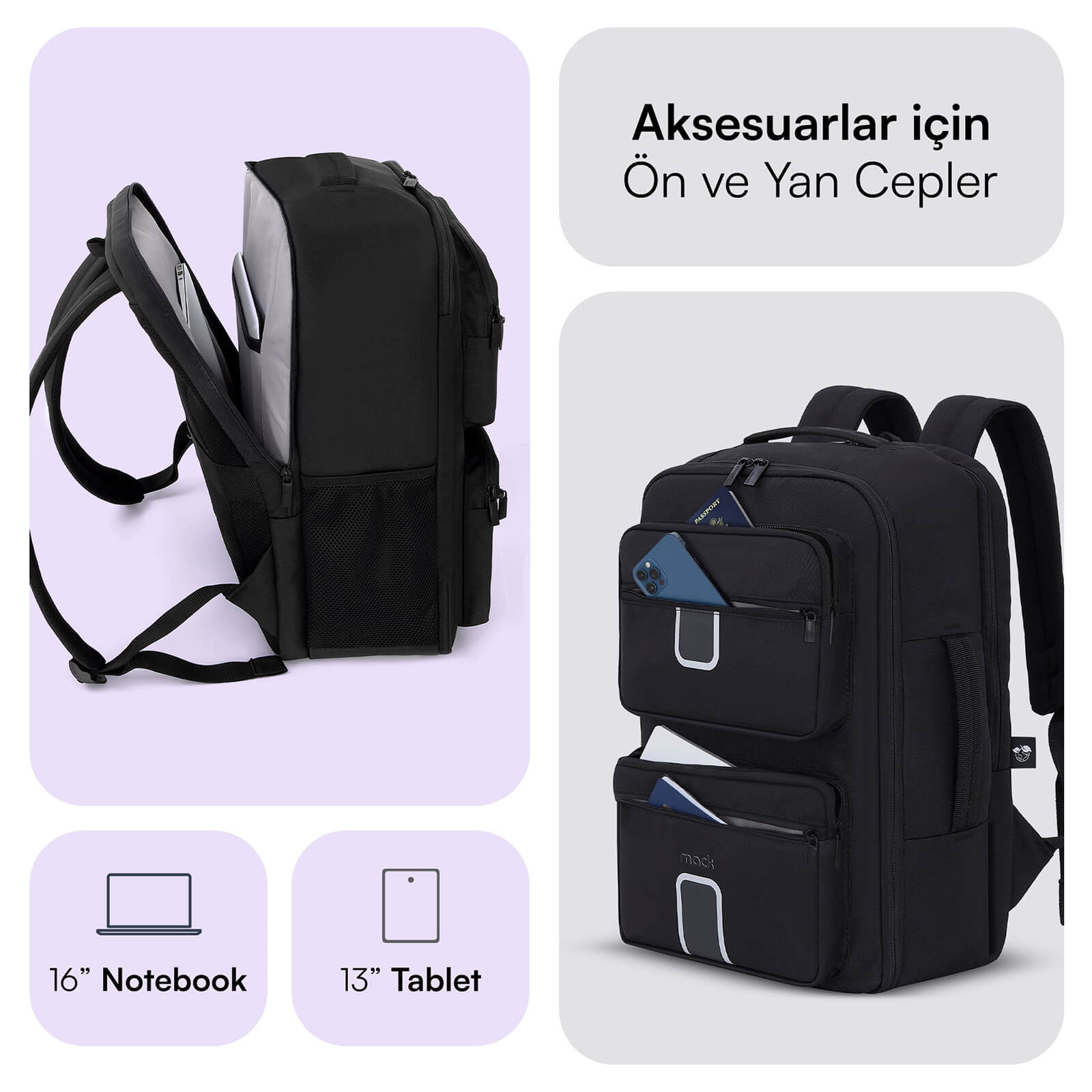 Maksimum Koruma: Seyahat sırt çantası, dizüstü bilgisayarınızı çizilmelere, çarpmalara ve düşmelere karşı koruyan dayanıklı iç malzemeye ve yüksek kaliteli dolguya sahip 16 inçlik bir dizüstü bilgisayar bölmesine ve 13 inçlik bir tablet bölmesine sahiptir. Ayrıca aksesuarlar için özel olarak tasarlanmış ön ve iç cepler, kullanıcının eşyalarını organize etmesine ve kolay erişim sağlamasına yardımcı olur.